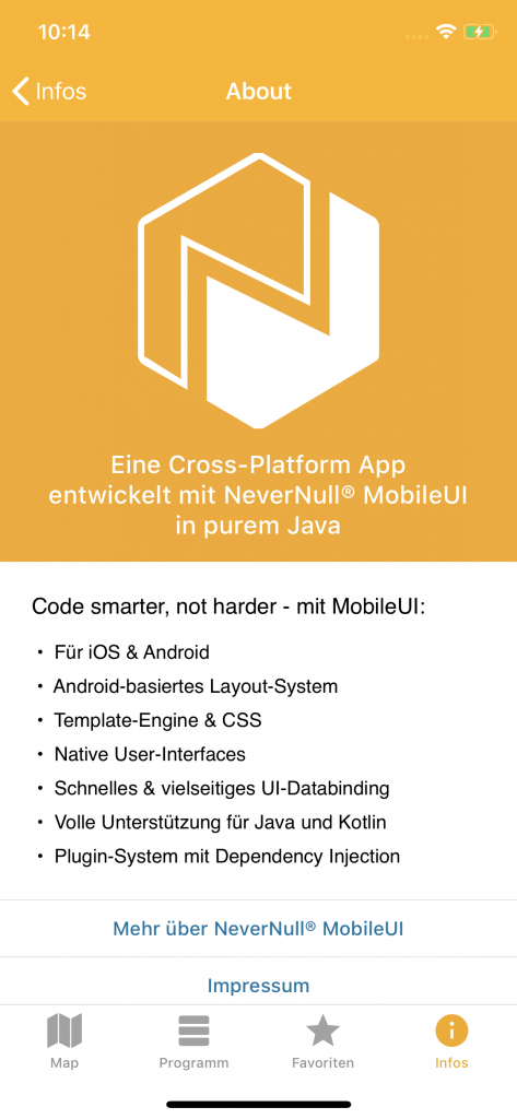 The Java Forum Stuttgart App was built using the MobileUI framework developed by NeverNull and has a code reuse of over 95% for iOS and Android.